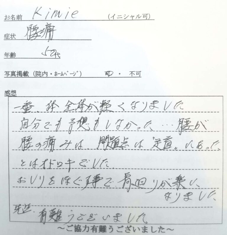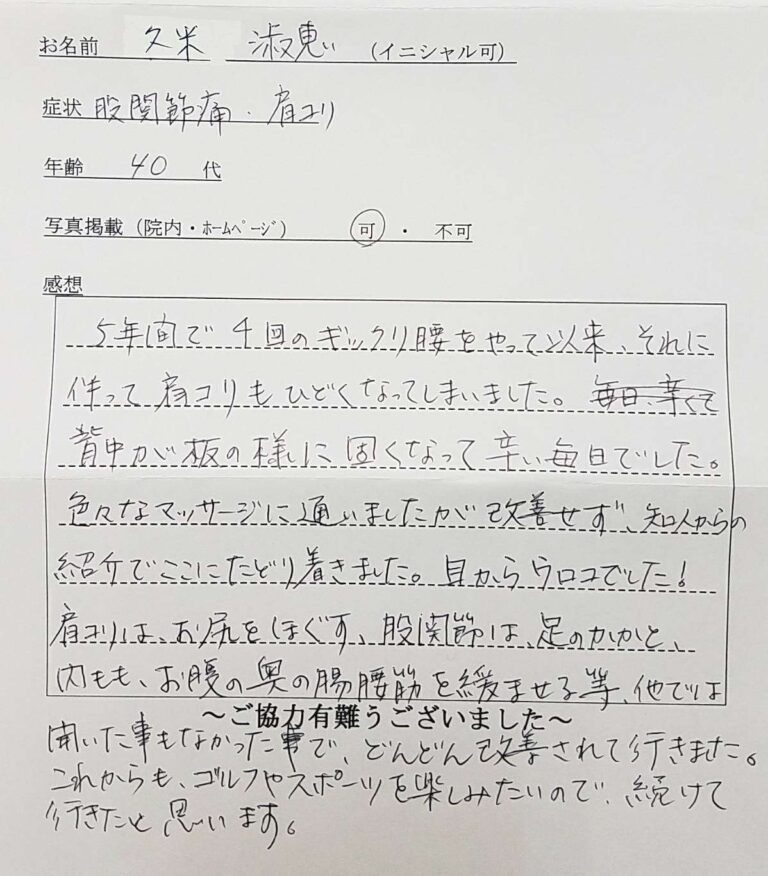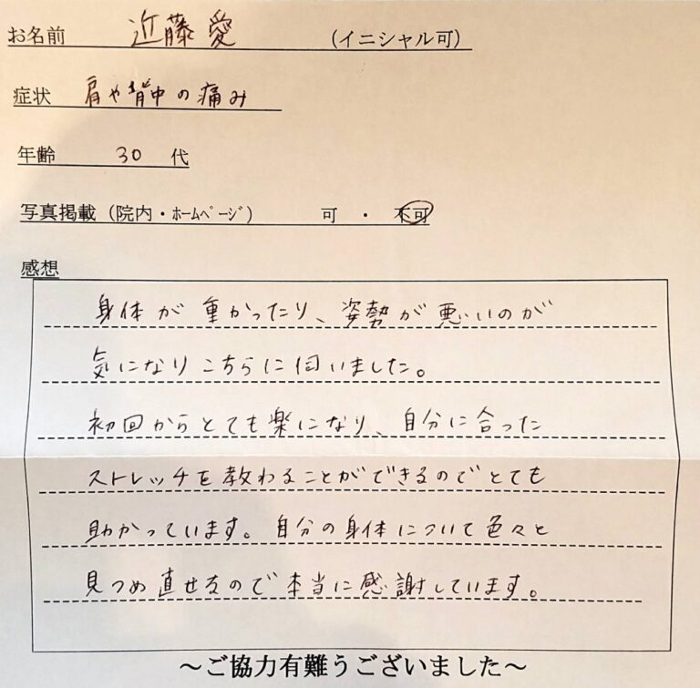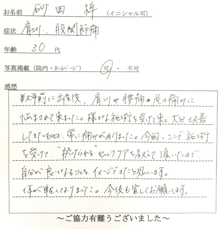 数年前に出産後、肩こりや腰痛、足の痛みに悩まされてきました。様々な施術を受けてきて、だいぶ改善してきたものの、常に痛みがありました。今回、ここで施術を受けて”続けられる”セルフケアを教えて頂いたので、自分が良くなることをイメージできたと思います。