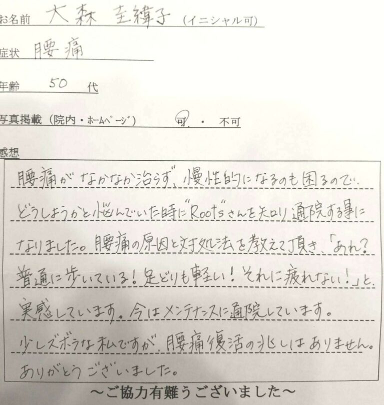 腰痛がなかなか治らず、慢性的になるのも困るのでどうしようかと悩んでいた時に”Roots”さんを知り通院する事になりました。腰痛の原因と対処法を教えて頂き、「あれ?普通に歩いている!足どりも軽い!それに疲れない!」と実感しています。今はメンテナンスに通院しています。