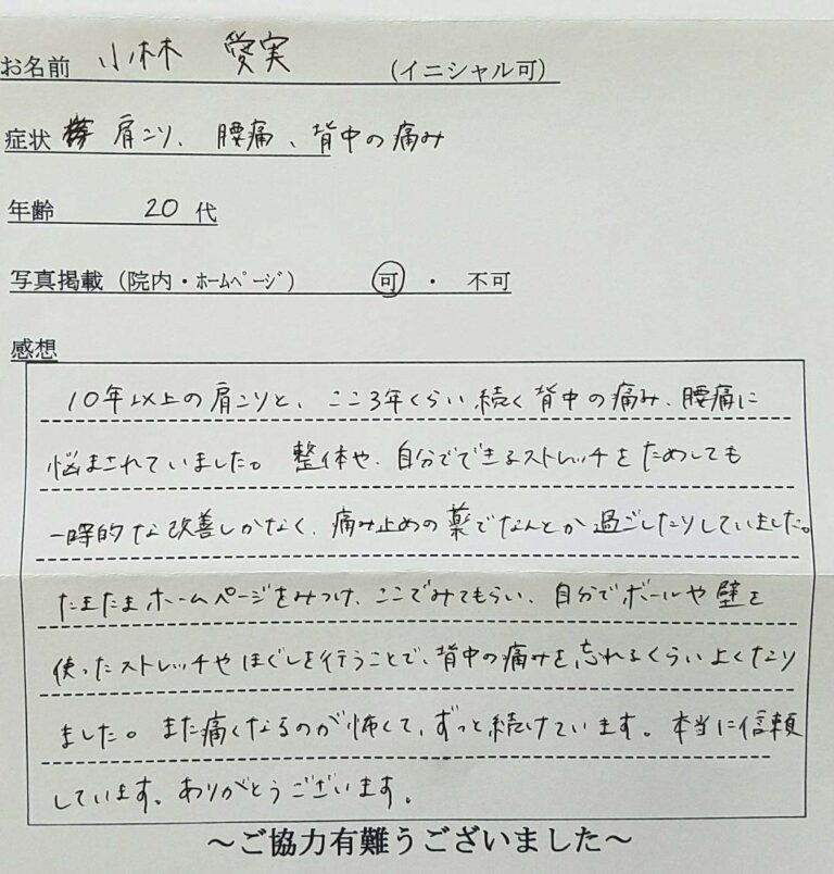 たまたまホームページで見つけ、ここでみてもらい、自分でボールや壁を使ったストレッチやほぐしを行うことで、背中の痛みを忘れるくらいよくなりました。また痛くなるのが怖くてずっと続けています。本当に信頼しています。