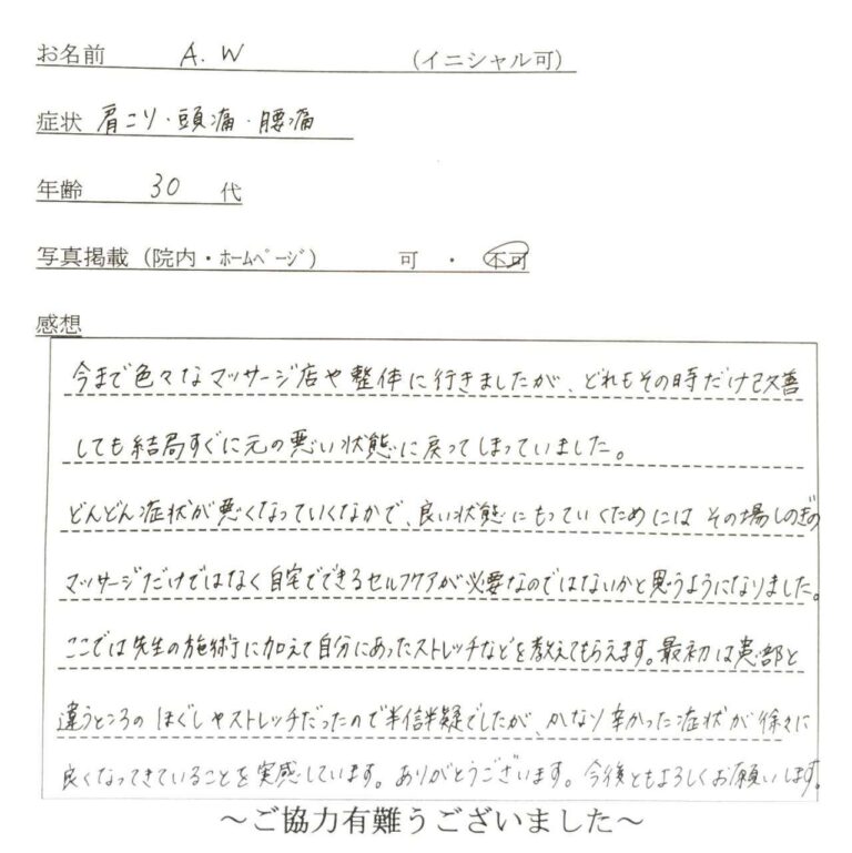 今まで色々なマッサージ店や整体に行きましたが、どれもその時だけ改善しても結局すぐに元の悪い状態に戻ってしまったいました。