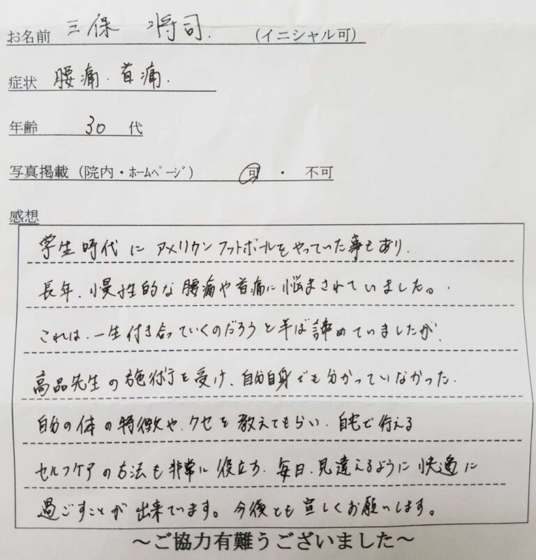 これは一生付き合っていくしかないのだろうと半ば諦めていましたが、高品先生の施術を受け、自分自身でもわかっていなかった自分の体の特徴やクセを教えてもらい、自宅で行えるセルフケアの方法も非常に役立ち毎日見違えるように快適に過ごすことが出来ています。