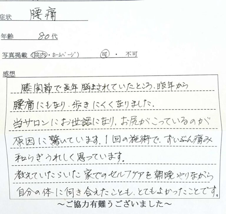 当サロンにお世話になり、お尻がこっているのが原因に驚いています。1回の施術でずいぶん痛みが和らぎうれしく思っています。