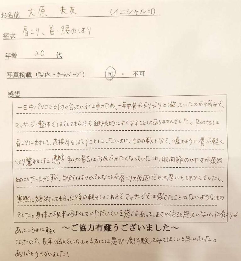 こちらの良いところは、痛みの理由とその改善方法について理論的に教えて頂け、納得が行く治療が受けられることと、家でできるセルフケアを教えて頂けるところです。このセルフケアは受診と並行して毎日やっていると非常に効果がありました。私のように他の医療機関で簡単に痛みはストレスによるものと決めてかかられた方にはRootsをお薦めします。